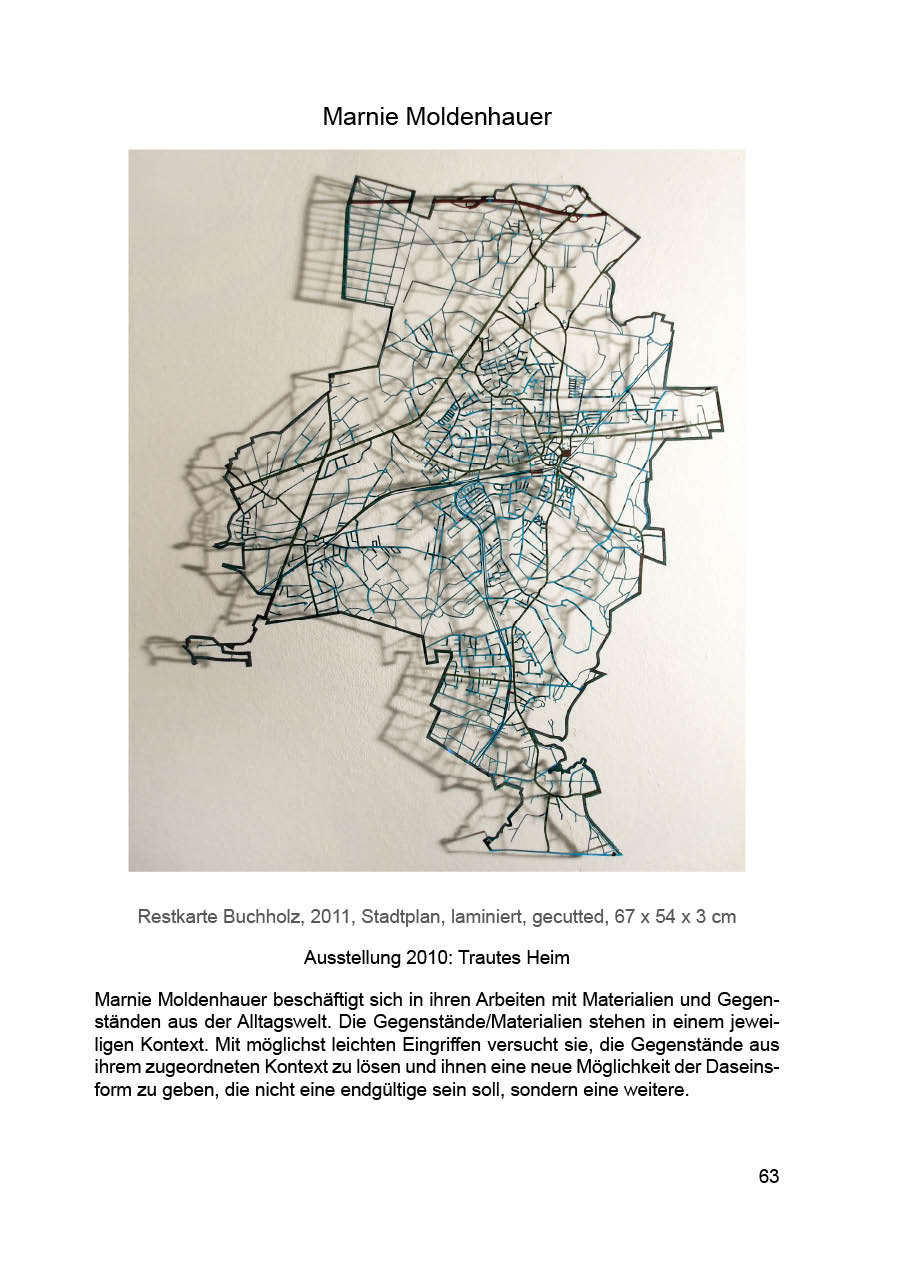 Marnie Moldenhauer beschäftigt sich in ihren Arbeiten mit Materialien und Gegenständen aus der Alltagswelt. Die Gegenstände / Materialien stehen in einem jeweiligen Kontext. Mit möglichst leichten Eingriffen versucht sie die Gegenstände aus ihrem zugeordneten Kontext zu lösen und ihnen eine neue Möglichkeit der Daseinsform zu geben, die nicht eine endgültige sein soll, sondern eine weitere. Dies geschieht einerseits durch Kombinationen verschiedener Gegenstände / Materialien, andererseits durch Veränderung der Gegenstände an sich (z.B. durch Ausschneiden und/oder Neukombination bestimmter Bestandteile ). Sie versucht, spielerisch mit den Gegenständen zu hantieren und durch dieses Spiel den funktionalisierten Umgang mit den Dingen und damit das eigene funktionalisierte Handeln zu unterlaufen. Bisher verdeckte Formen und Eigenschaften des Gegenstandes/Materials sollen entdeckt und neu sichtbar herausgearbeitet werden.